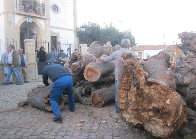 A empreitada arrancou de manhã cedo no meio de um sobreiral nos arredores de Ladoeiro, onde oito reboques – um por cada festeiro – são carregados com madeiros. O labor que antigamente era feito com recurso a juntas de bois e força braçal, num esforço colaborativo de dezenas de homens, hoje é facilitado por maquinaria e tratores. Mas a animação, essa, mantém-se e o processo é acompanhado por dezenas de homens de diferentes gerações.